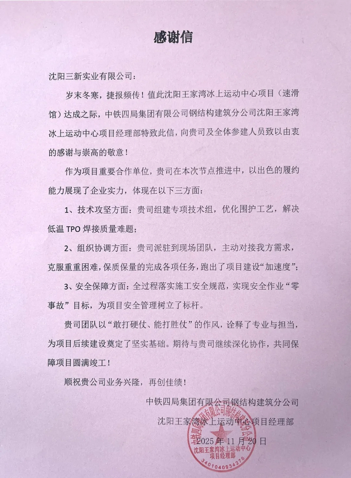 日前,中鐵四局項(xiàng)目部的感謝信跨越金秋而來,字里行間滿是對三新的敬意:“技術(shù)攻堅(jiān)破局、組織協(xié)調(diào)高效、安全保障扎實(shí),以‘三新力量’為場館如期封閉筑牢根基。”這紙贊譽(yù)背后,是汗水與堅(jiān)守的沉淀,更是對東北建筑鐵軍匠心與實(shí)力的最佳詮釋。